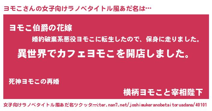 | 男性向けラノベタイトル風あだ名 | 『誰もが恐れるあのヨモこが、ぼくの専属メイドになるようです。』 |