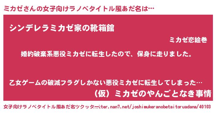 | 男性向けラノベタイトル風あだ名 | 『ミカゼスレイヤー』『緋弾のミカゼ』 |