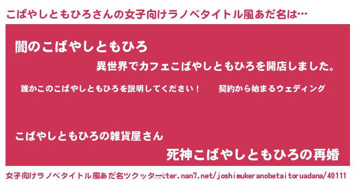 こばやしともひろさんの女子向けラノベタイトル風あだ名は… 『誰かこのこばやしともひろを説明してください! ~契約から始まるウェディング~』『闇のこばやしともひろ』『死神こばやしともひろの再婚』 ツクッター #女子向けラノベタイトル風あだ名ツクッター http://tkutter.nan7.net/joshimukeranobetaitoruadana/40111/