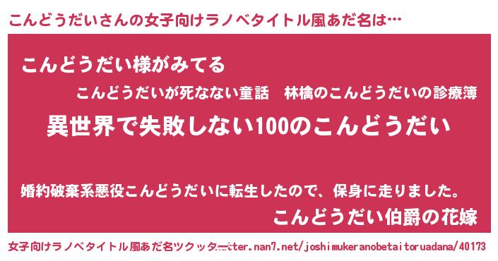 | 男性向けラノベタイトル風あだ名 | 『こんどうだいという概念が存在しない退屈な世界 』 |