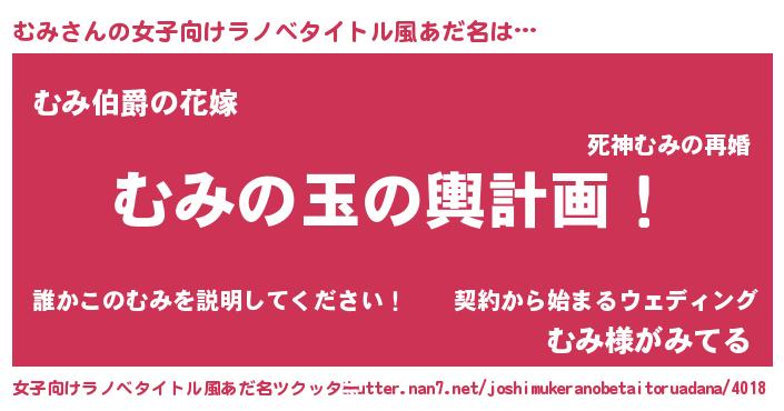 | 男性向けラノベタイトル風あだ名 | 『むみ~年齢イコール彼女いない歴の魔法使い~』 |