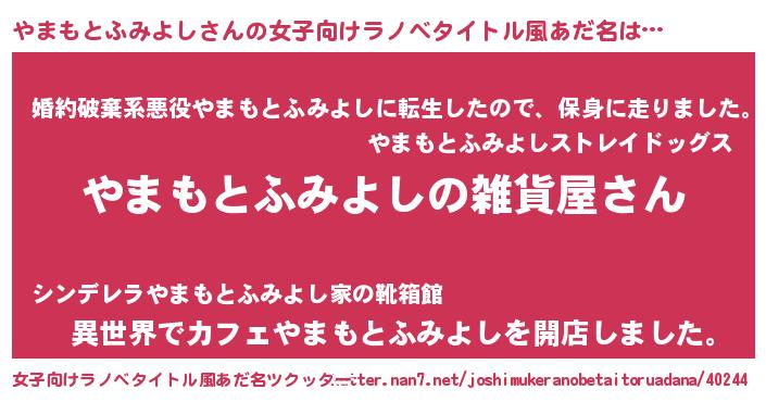 | 男性向けラノベタイトル風あだ名 | 『やはりやまもとふみよしの青春ラブコメはまちがっている 』 |
