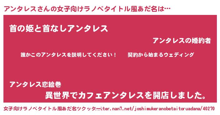 | 男性向けラノベタイトル風あだ名 | 『アンタレスアートオンライン』 |
