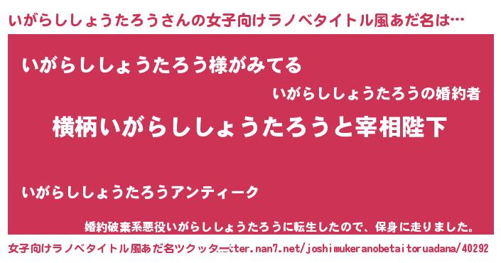 | 男性向けラノベタイトル風あだ名 | 『いがらししょうたろうに滅ぼされるだけの簡単なお仕事です』 |