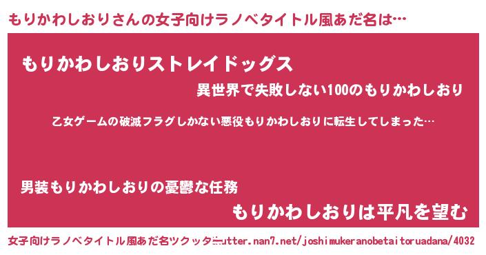 | 男性向けラノベタイトル風あだ名 | 『魔弾の王ともりかわしおり』 |