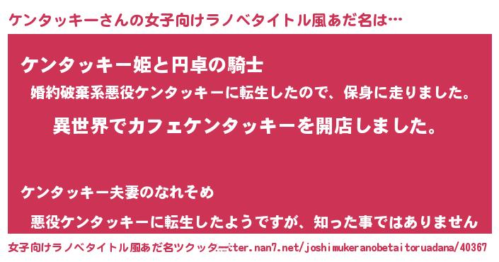 | 男性向けラノベタイトル風あだ名 | 『誰もが恐れるあのケンタッキーが、ぼくの専属メイドになるようです。』 |