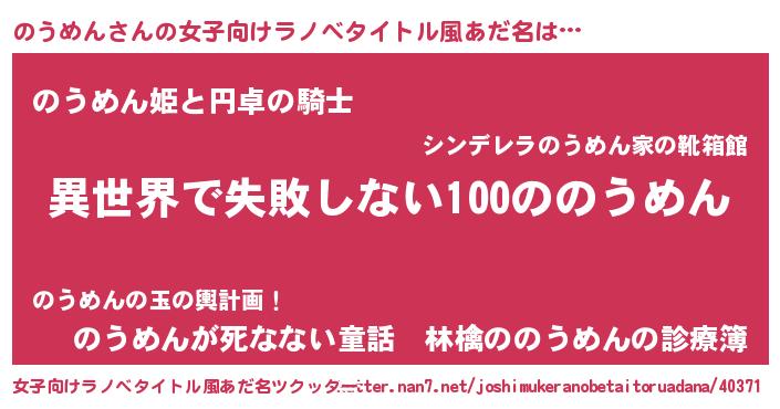 | 男性向けラノベタイトル風あだ名 | 『のうめんという概念が存在しない退屈な世界 』 |