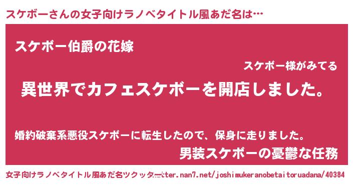 | 男性向けラノベタイトル風あだ名 | 『誰もが恐れるあのスケボーが、ぼくの専属メイドになるようです。』 |