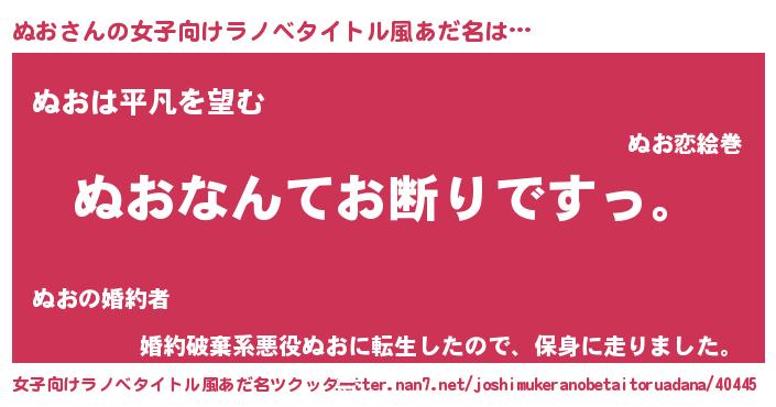 | 男性向けラノベタイトル風あだ名 | 『魔法科高校のぬお』『ヌオスレイヤー』 |