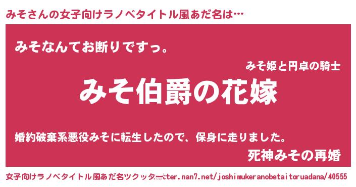 | 男性向けラノベタイトル風あだ名 | 『うちの娘の為ならば、俺はもしかしたらみそも倒せるかもしれない。』 |