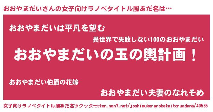 | 男性向けラノベタイトル風あだ名 | 『おおやまだい~年齢イコール彼女いない歴の魔法使い~』 |