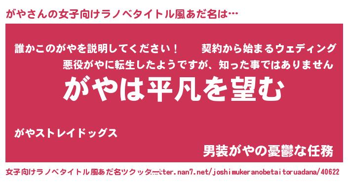 | 男性向けラノベタイトル風あだ名 | 『ダンジョンにがやを求めるのは間違っているだろうか』 |
