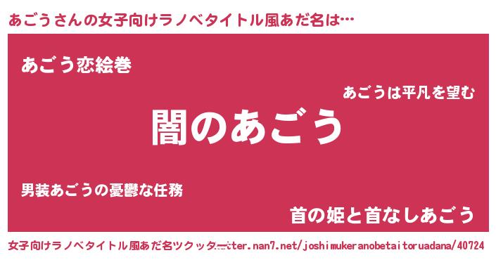 | 男性向けラノベタイトル風あだ名 | 『Re:あごうから始める異世界生活』 |