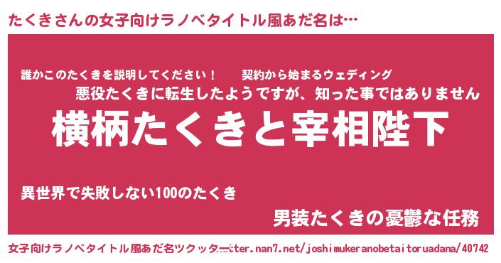 | 男性向けラノベタイトル風あだ名 | 『たくきに滅ぼされるだけの簡単なお仕事です』 |