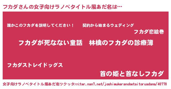 | 男性向けラノベタイトル風あだ名 | 『魔弾の王とフカダ』 |