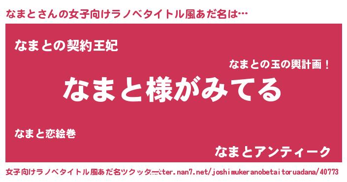 | 男性向けラノベタイトル風あだ名 | 『なまとの嫁は女の子じゃないと思った?』 |