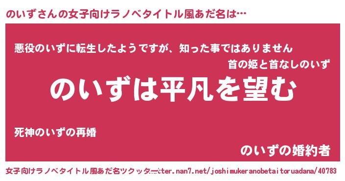 のいずさんの女子向けラノベタイトル風あだ名は… 『のいずは平凡を望む』『悪役のいずに転生したようですが、知った事ではありません』『のいずの婚約者』 ツクッター #女子向けラノベタイトル風あだ名ツクッター http://tkutter.nan7.net/joshimukeranobetaitoruadana/40783/