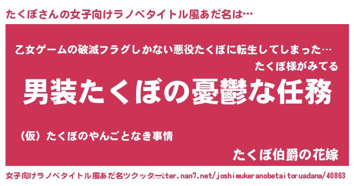 | 胡散臭い通販商品みたいなあだ名 | 『あなたにだけ特別に提供する限定10本のレアな日本酒…その名も「たくぼ」』 |