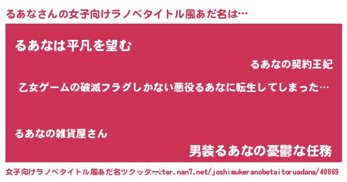| 男性向けラノベタイトル風あだ名 | 『この素晴らしい世界にるあなを!』 |