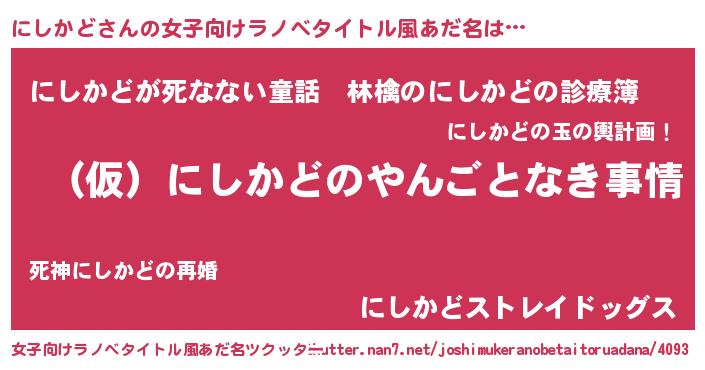 | 男性向けラノベタイトル風あだ名 | 『にしかどの憂鬱』『魔弾の王とにしかど』 |