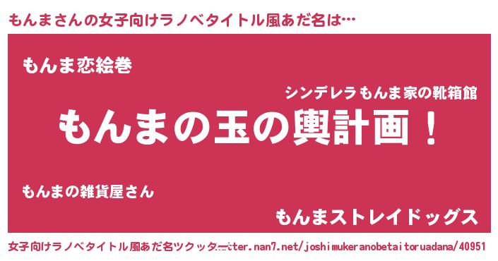 | 男性向けラノベタイトル風あだ名 | 『もんま~年齢イコール彼女いない歴の魔法使い~』 |