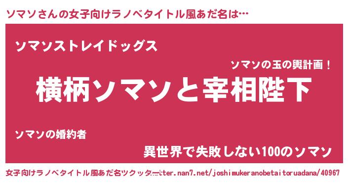 | 男性向けラノベタイトル風あだ名 | 『ソマソに滅ぼされるだけの簡単なお仕事です』 |