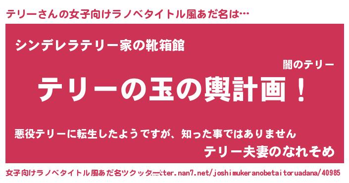 | 男性向けラノベタイトル風あだ名 | 『テリー~年齢イコール彼女いない歴の魔法使い~』 |