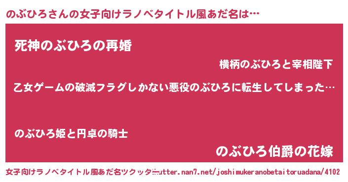 | 男性向けラノベタイトル風あだ名 | 『この素晴らしい世界にのぶひろを!』 |