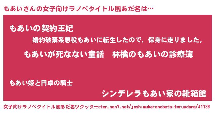 | 男性向けラノベタイトル風あだ名 | 『魔弾の王ともあい』『緋弾のモアイ』 |