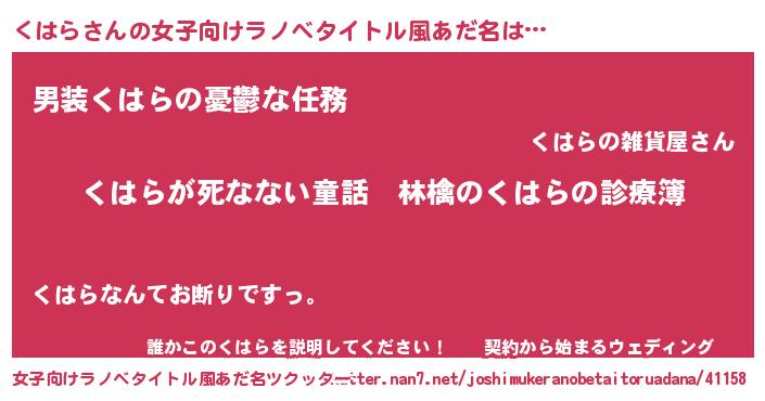 くはらさんの女子向けラノベタイトル風あだ名は… 『くはらが死なない童話 林檎のくはらの診療簿』『男装くはらの憂鬱な任務』『誰かこのくはらを説明してください! ~契約から始まるウェディング~』 ツクッター #女子向けラノベタイトル風あだ名ツクッター http://tkutter.nan7.net/joshimukeranobetaitoruadana/41158/