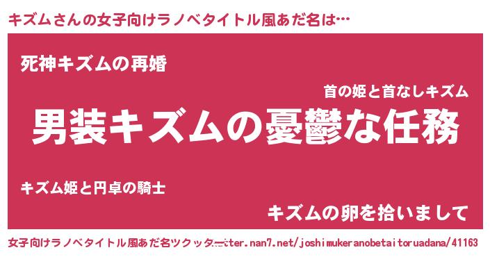 キズムさんの女子向けラノベタイトル風あだ名は… 『男装キズムの憂鬱な任務』『死神キズムの再婚』『キズムの卵を拾いまして』 ツクッター #女子向けラノベタイトル風あだ名ツクッター http://tkutter.nan7.net/joshimukeranobetaitoruadana/41163/