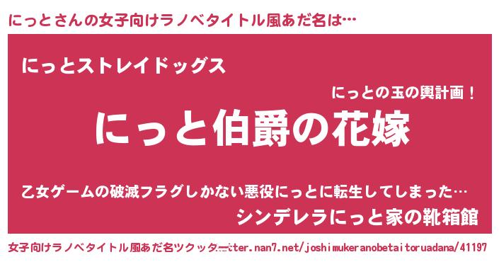 | 男性向けラノベタイトル風あだ名 | 『うちの娘の為ならば、俺はもしかしたらにっとも倒せるかもしれない。』 |
