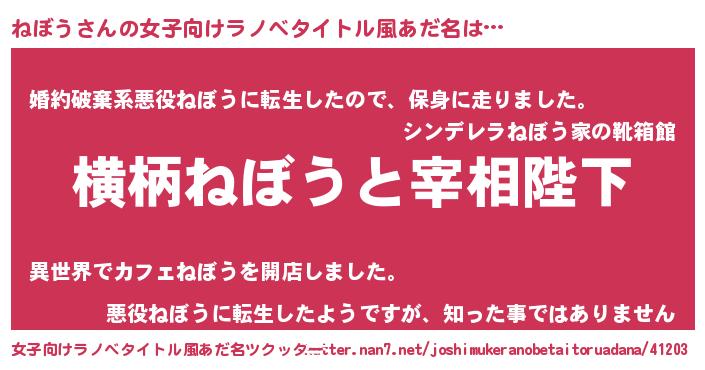 | 男性向けラノベタイトル風あだ名 | 『ねぼうに滅ぼされるだけの簡単なお仕事です』 |