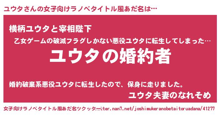 | 男性向けラノベタイトル風あだ名 | 『うちの娘の為ならば、俺はもしかしたらユウタも倒せるかもしれない。』 |