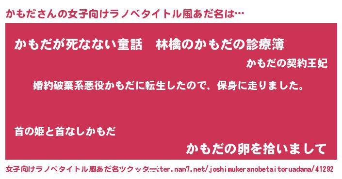 | 男性向けラノベタイトル風あだ名 | 『カモダスレイヤー』『魔弾の王とかもだ』 |