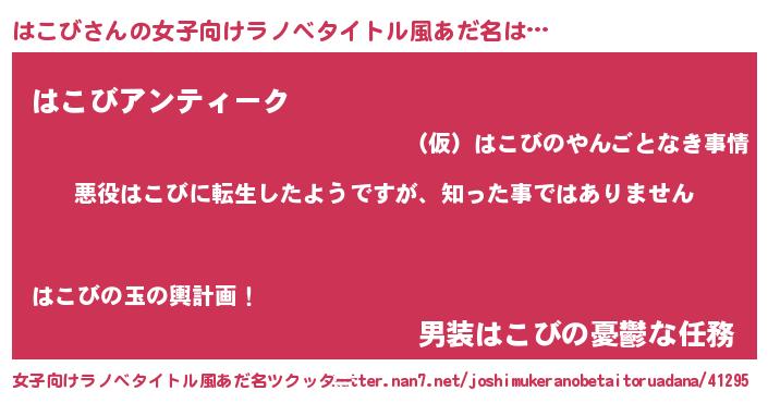 | 男性向けラノベタイトル風あだ名 | 『この素晴らしい世界にはこびを!』 |