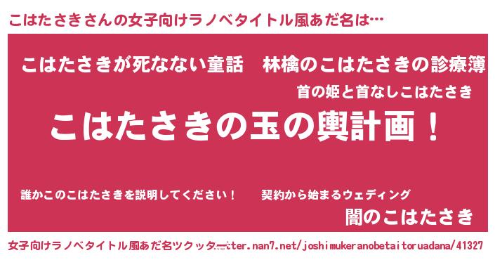 | 男性向けラノベタイトル風あだ名 | 『こはたさき~年齢イコール彼女いない歴の魔法使い~』 |