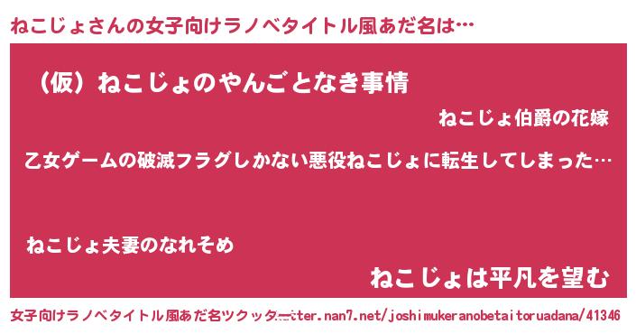 | 男性向けラノベタイトル風あだ名 | 『この素晴らしい世界にねこじょを!』 |