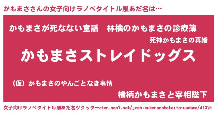 | 男性向けラノベタイトル風あだ名 | 『Re:かもまさから始める異世界生活』 |