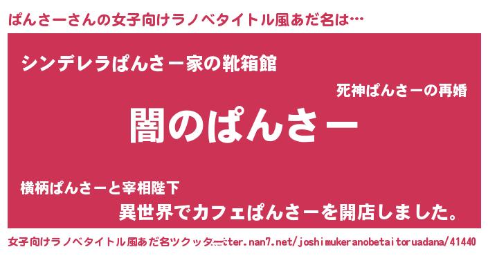 | 男性向けラノベタイトル風あだ名 | 『Re:ぱんさーから始める異世界生活』 |