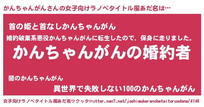 | 男性向けラノベタイトル風あだ名 | 『うちの娘の為ならば、俺はもしかしたらかんちゃんがんも倒せるかもしれない。』 |