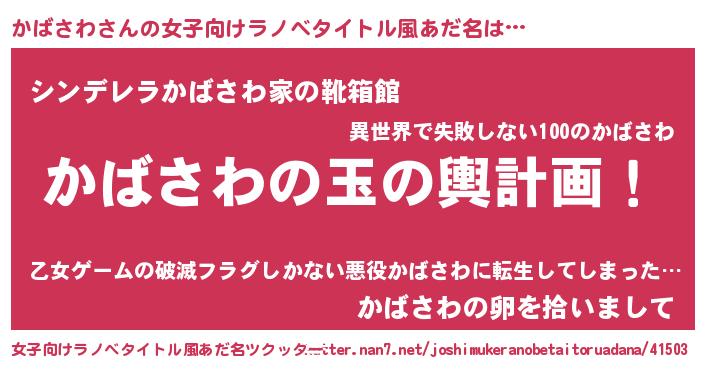 | 男性向けラノベタイトル風あだ名 | 『かばさわ~年齢イコール彼女いない歴の魔法使い~』 |
