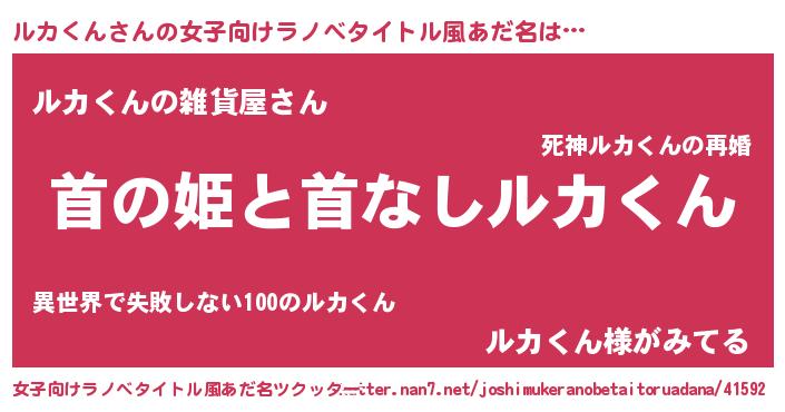 ルカくんさんの女子向けラノベタイトル風あだ名は… 『首の姫と首なしルカくん』『ルカくんの雑貨屋さん』『ルカくん様がみてる』 ツクッター #女子向けラノベタイトル風あだ名ツクッター http://tkutter.nan7.net/joshimukeranobetaitoruadana/41592/