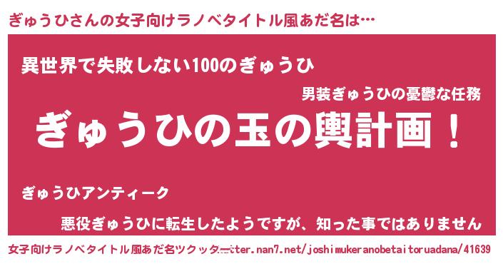 | 男性向けラノベタイトル風あだ名 | 『転生したらぎゅうひだった件』 |