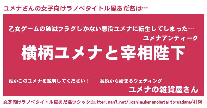 | 男性向けラノベタイトル風あだ名 | 『ユメナに滅ぼされるだけの簡単なお仕事です』 |