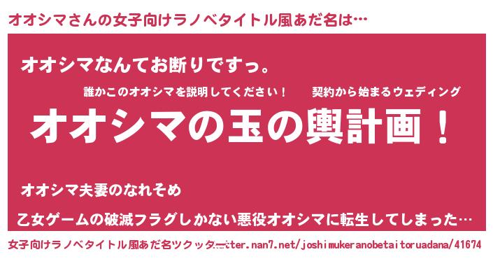 | 男性向けラノベタイトル風あだ名 | 『転生したらオオシマだった件』 |