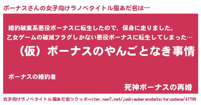 ボーナスさんの女子向けラノベタイトル風あだ名は… 『(仮)ボーナスのやんごとなき事情』『婚約破棄系悪役ボーナスに転生したので、保身に走りました。』『死神ボーナスの再婚』 ツクッター #女子向けラノベタイトル風あだ名ツクッター http://tkutter.nan7.net/joshimukeranobetaitoruadana/41709/