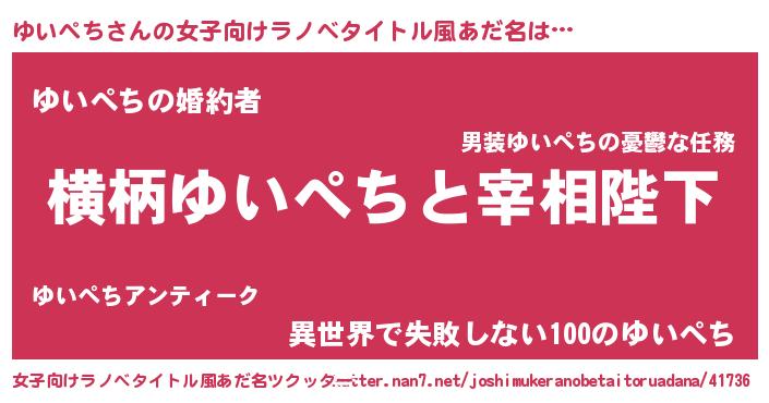 ゆいぺちさんの女子向けラノベタイトル風あだ名は… 『横柄ゆいぺちと宰相陛下』『ゆいぺちの婚約者』『異世界で失敗しない100のゆいぺち』 ツクッター #女子向けラノベタイトル風あだ名ツクッター http://tkutter.nan7.net/joshimukeranobetaitoruadana/41736/