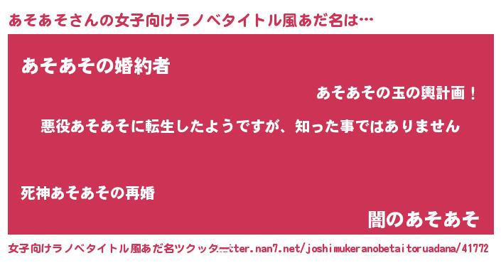 | 男性向けラノベタイトル風あだ名 | 『この素晴らしい世界にあそあそを!』 |