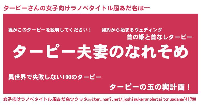 | 男性向けラノベタイトル風あだ名 | 『おまえをオタクにしてやるから、俺をターピーにしてくれ! 』 |